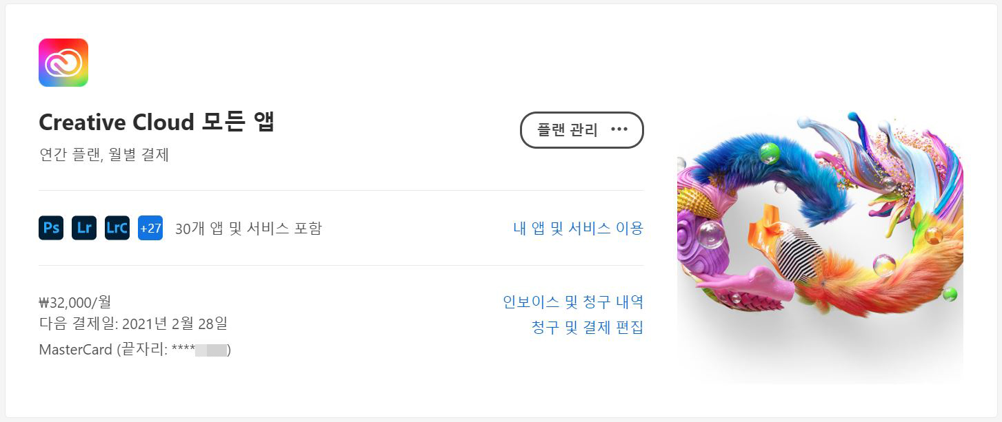 그리고 포코그래피 플랜을 사용한지 약 1년이 지난 지금, 이제는 포토샵 뿐만이 아니라 동영상 편집에 사용하던 MOVAVI의 기능적 한계로 느끼던 아쉬움을 해결하기 위해 프리미어 등 Adobe 제품군 전체에 대한 구독으로 변경하게 되었습니다.