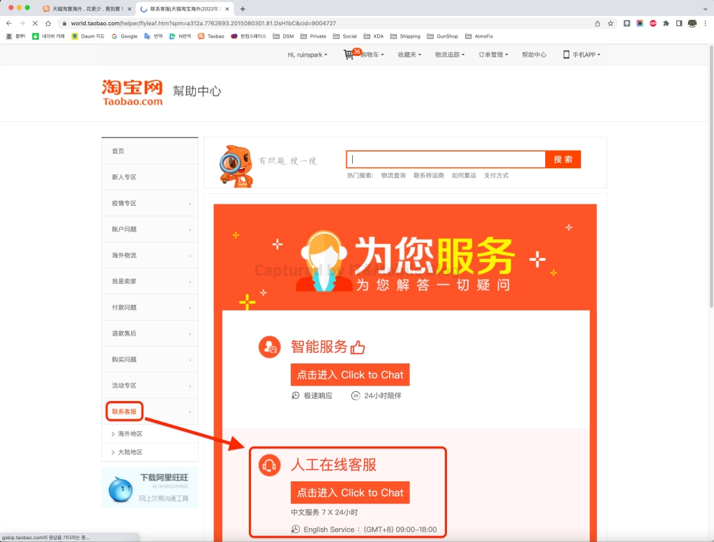중국어 잘 하시는 분들이라면 바로 국제 전화를 해버리면 그만이겠지만 저처럼 중알못이라면 타오바오 메인 화면 우상단에 있는 고객센터 메뉴를 통해서 채팅으로 상담을 진행할 수 있습니다.(영어 상담은 중국시간 09:00~18:00만 가능, 1분간 상담 내용 미입력시 상담 종료)
