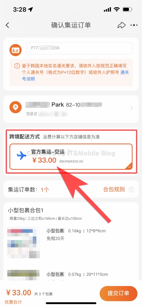 저는 3가지 제품을 공식 합배송으로 신청하면서 33위안(약 6,300원, 카드수수료 3% 별도)이 배송 요금으로 책정이 되었는데요.