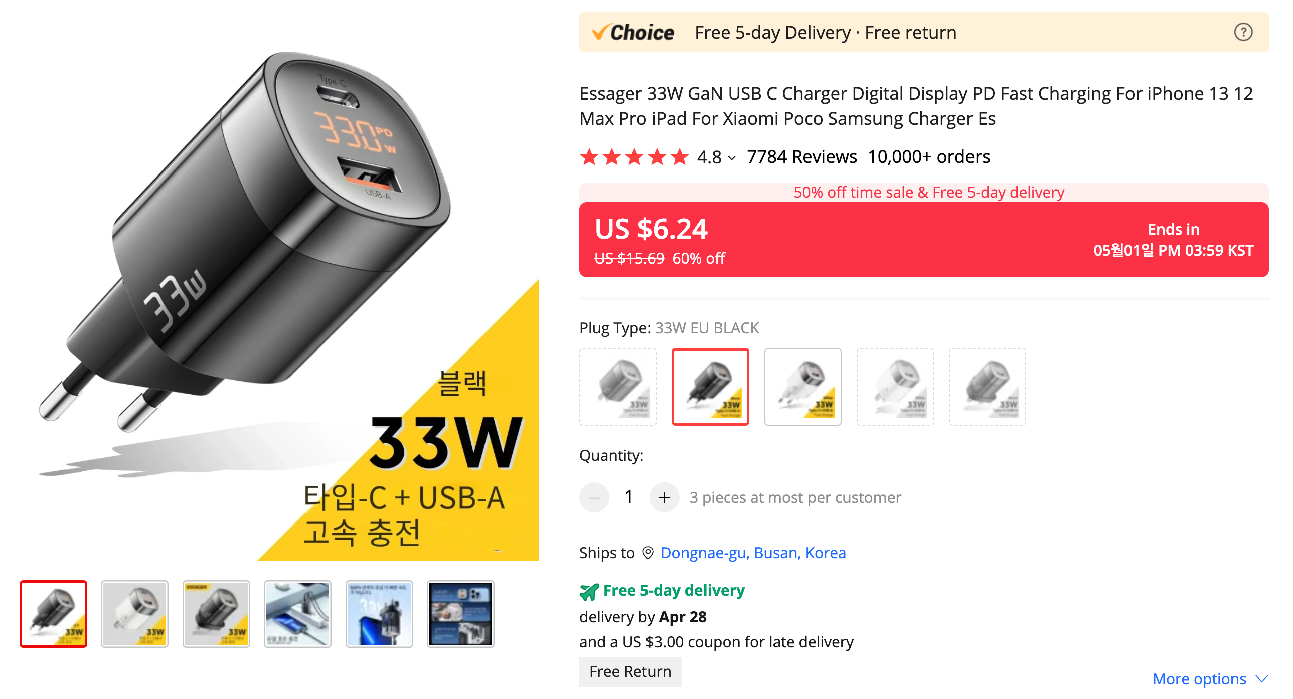 다이소나 할인마트, 편의점 등 오프라인에서는 5V 2A 정도 지원하는 충전기가 만 원대에 판매되고 있는 걸 생각하면 USB-C에 최대 33W 출력의 충전기가 5달러 정도, 여기에 해외 직구임에도 5일 배송까지 지원한다는 건 가히 충격적인 일이 아닐까 싶은데요.