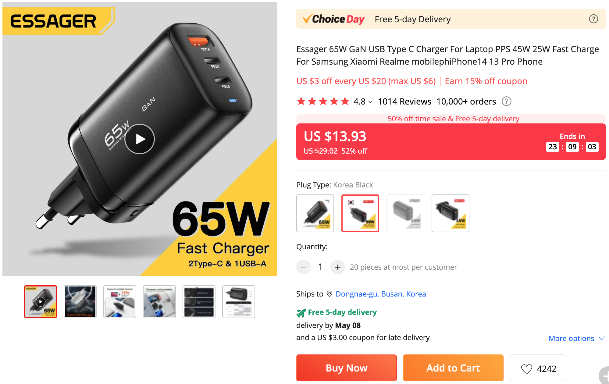 특히나 알리 익스프레스는 브랜드가 달라도 디자인이 동일하거나, 디자인이 조금 달라도 회로 스펙이 동일한 충전기들이 여럿 판매가 되고 있기 때문에 괜히 유명 브랜드 제품을 비싸게 구매할 이유가 없는 쇼핑몰이기도 하고요.
