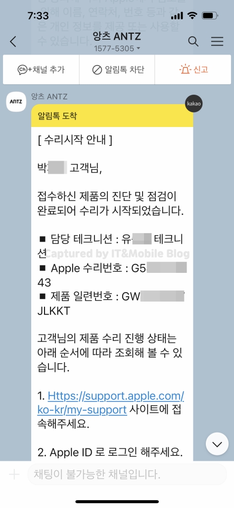 서비스 당일 예약 안내부터 수리 접수와 수리 시작, 그리고 어제 리퍼 제품이 도착을 한 건지 수리가 완료되었다는 알림까지 별다른 궁금증을 가질 필요가 없도록 필요한 정보들은 카톡으로 계속 안내가 되었습니다.